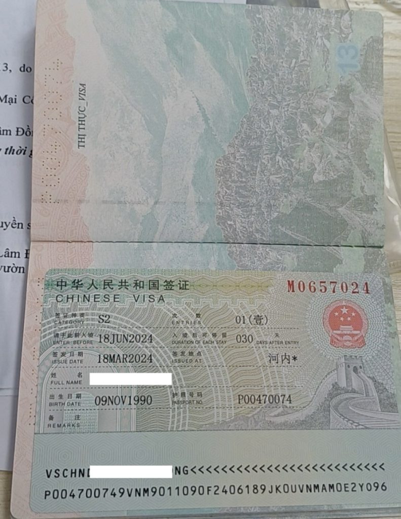 - Hộ chiếu do cơ quan có thẩm quyền của Trung Quốc cấp, còn hạn sử dụng (bản phô tô hoặc bản chụp);