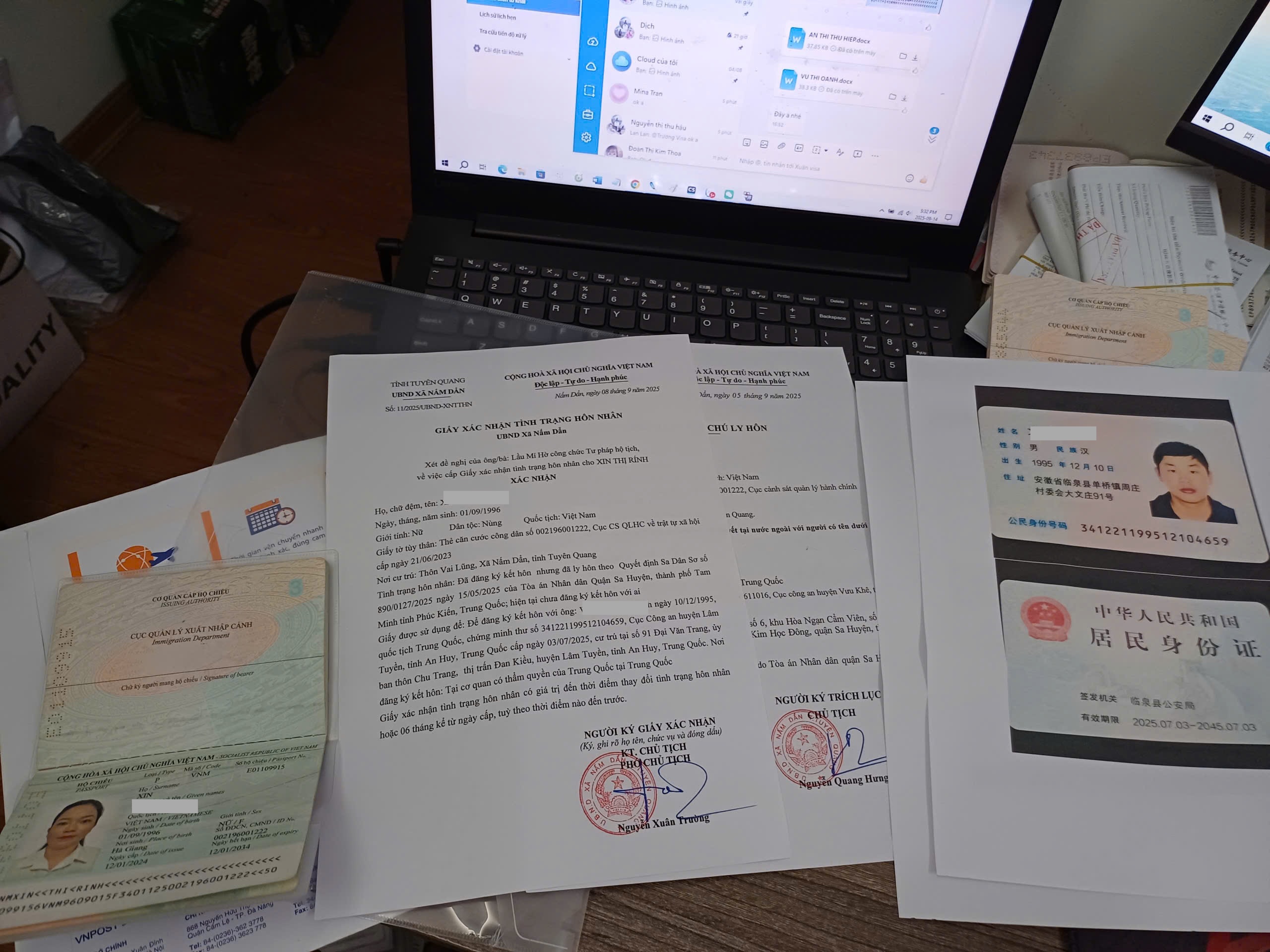 - Giấy tờ đăng ký kết hôn với người Trung Quốc tại cơ quan có thẩm quyền của Việt Nam;