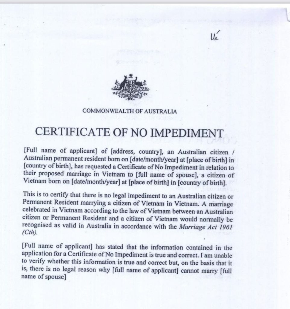 - Công hàm không cản trở hôn nhân của Úc, do cơ quan có thẩm quyền của Úc cấp, xác nhận không có gì cản trở việc kết hôn của người Úc và người Việt, đã được cơ quan lãnh sự của Úc xác nhận lãnh sự và được cơ quan lãnh sự của Việt Nam hợp pháp hóa lãnh sự (bản chính);