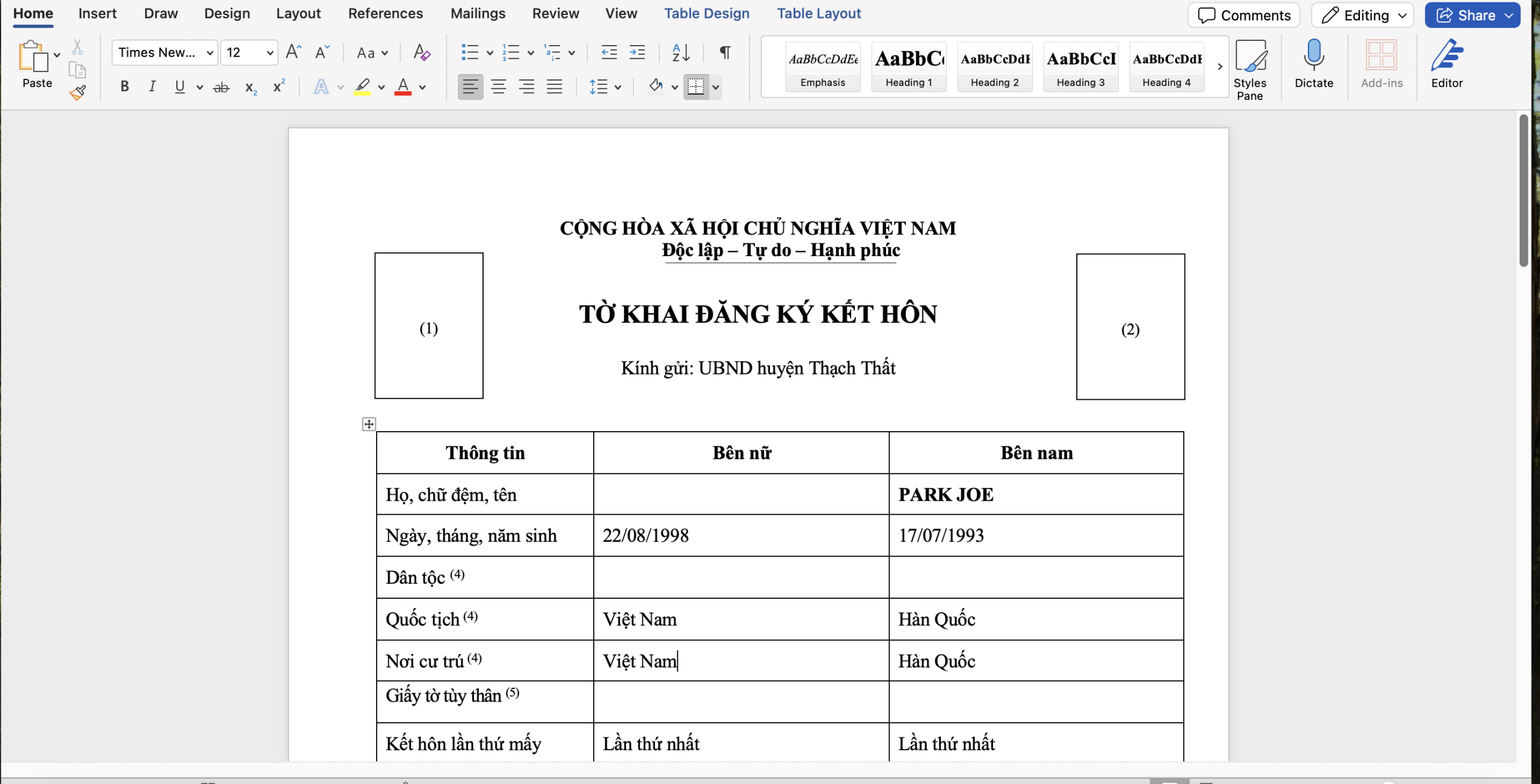- Tờ khai đăng ký kết hôn với người Hàn Quốc theo mẫu mới nhất, có dán ảnh thẻ của nam, nữ, có chữ ký của cả hai bên (tải mẫu tờ khai đăng ký kết hôn tại đây);