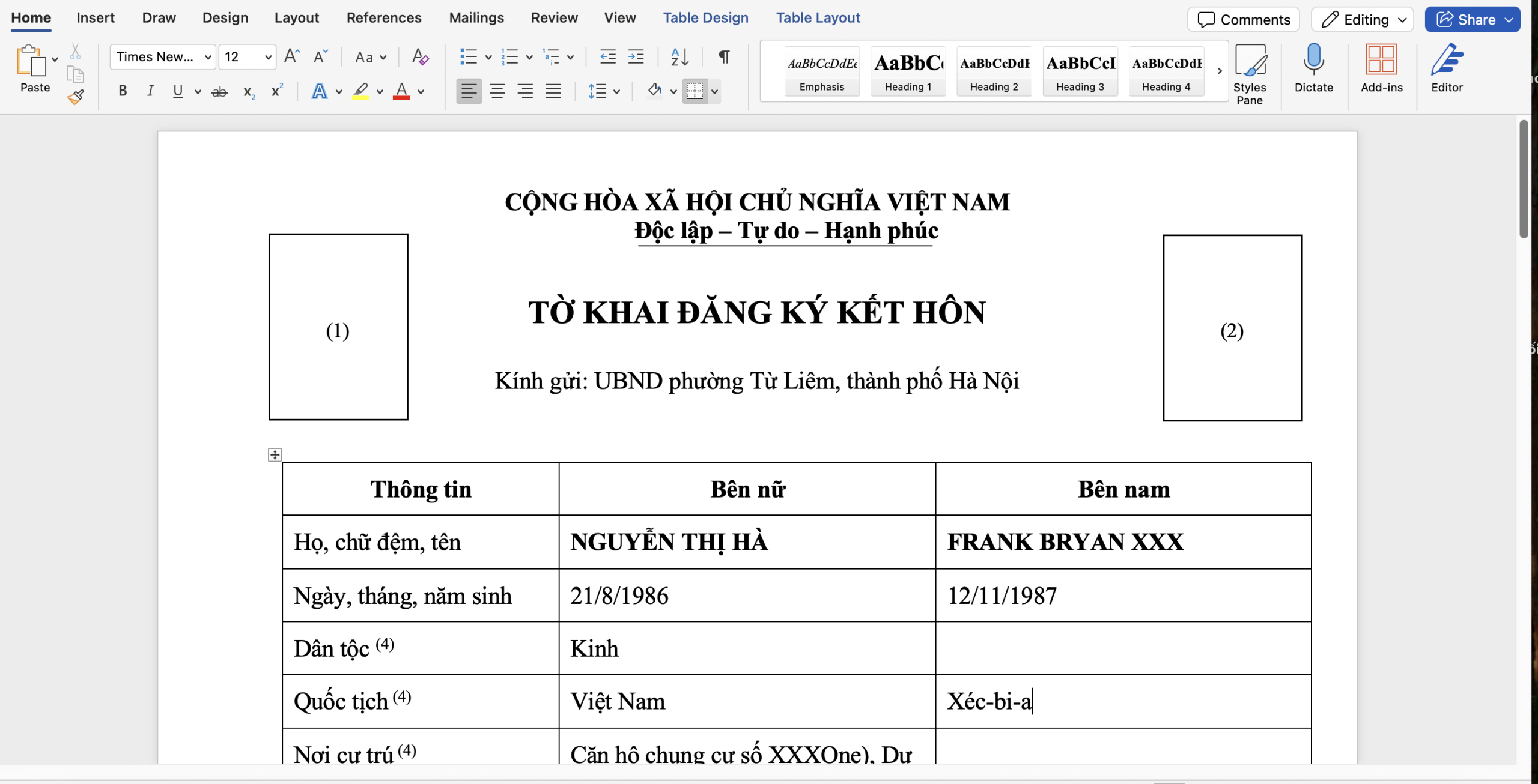 Tờ khai đăng ký kết hôn để thực hiện thủ tục kết hôn với người Xéc-bi-a