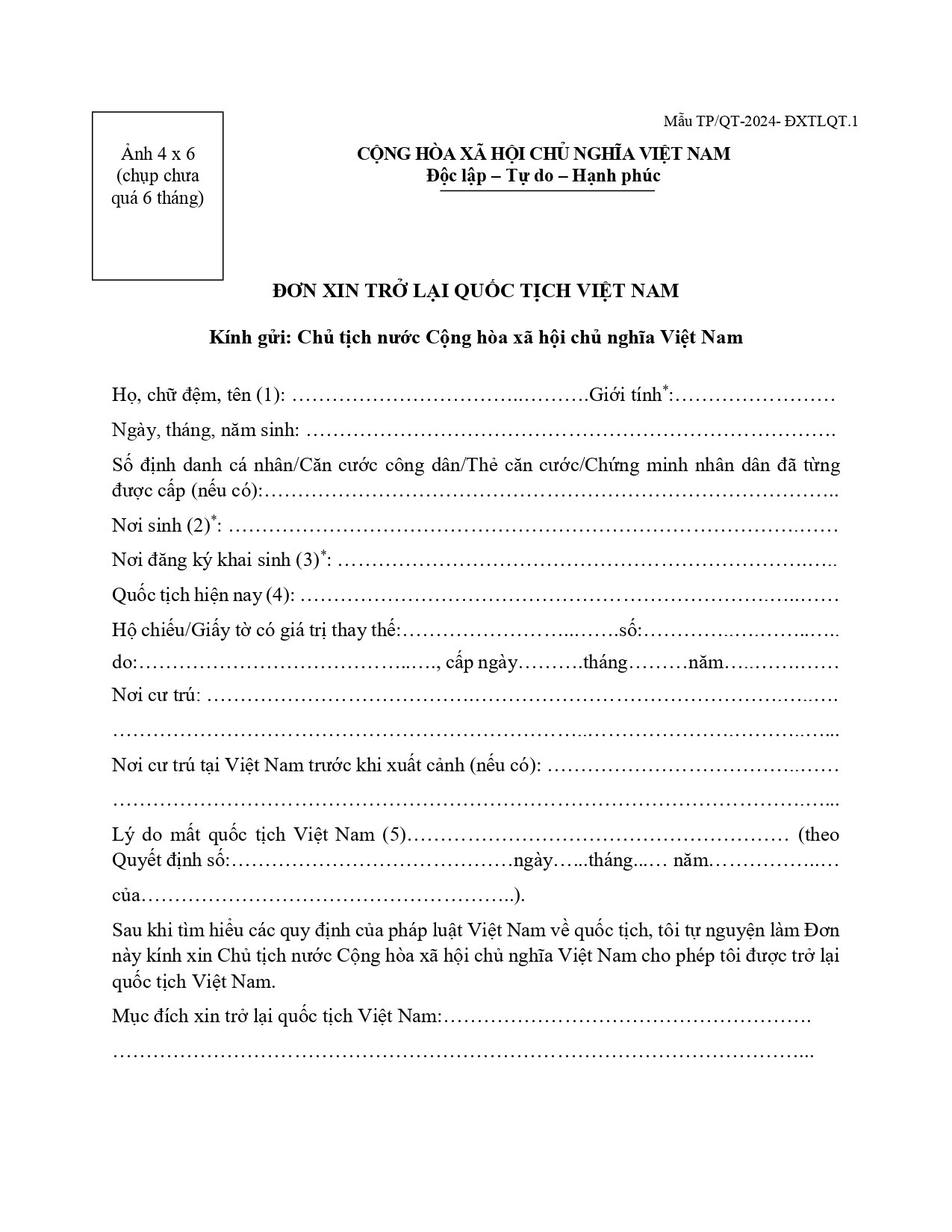 - Đơn xin trở lại quốc tịch Việt Nam theo mẫu (tải tờ đơn tại đây).