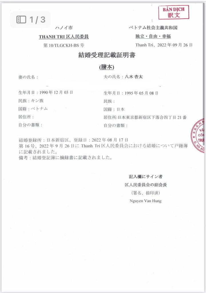 Dựa trên giấy tờ mà các bạn cung cấp, cơ quan có thẩm quyền của Việt Nam sẽ ghi vào Sổ hộ tịch việc kết hôn của công dân Việt Nam đã được giải quyết tại nước ngoài và cấp Giấy trích lục ghi chú kết hôn cho công dân. Trường hợp kết hôn tại Việt Nam thì người Nhật Bản sẽ thực hiện thủ tục ghi chú kết hôn tại cơ quan có thẩm quyền của Nhật Bản.